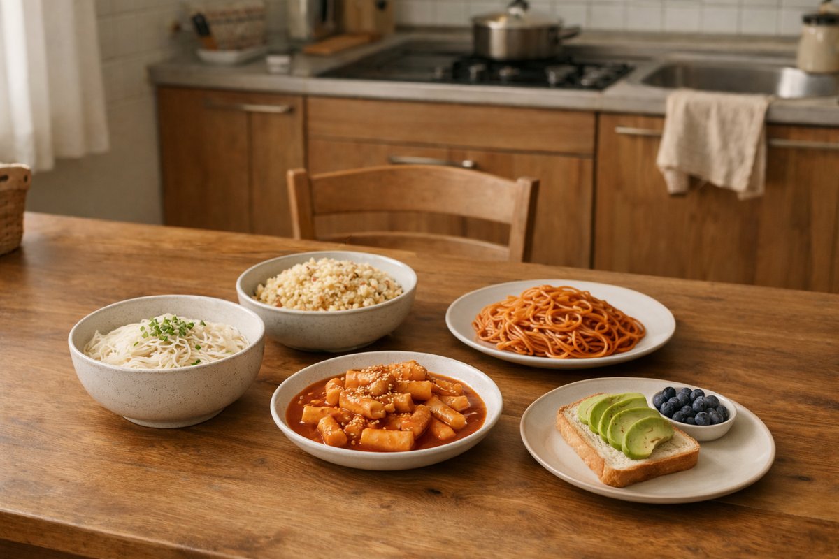 - 한 끼 메인: 쌀국수 / 떡볶이 / 볶음밥 / 스파게티